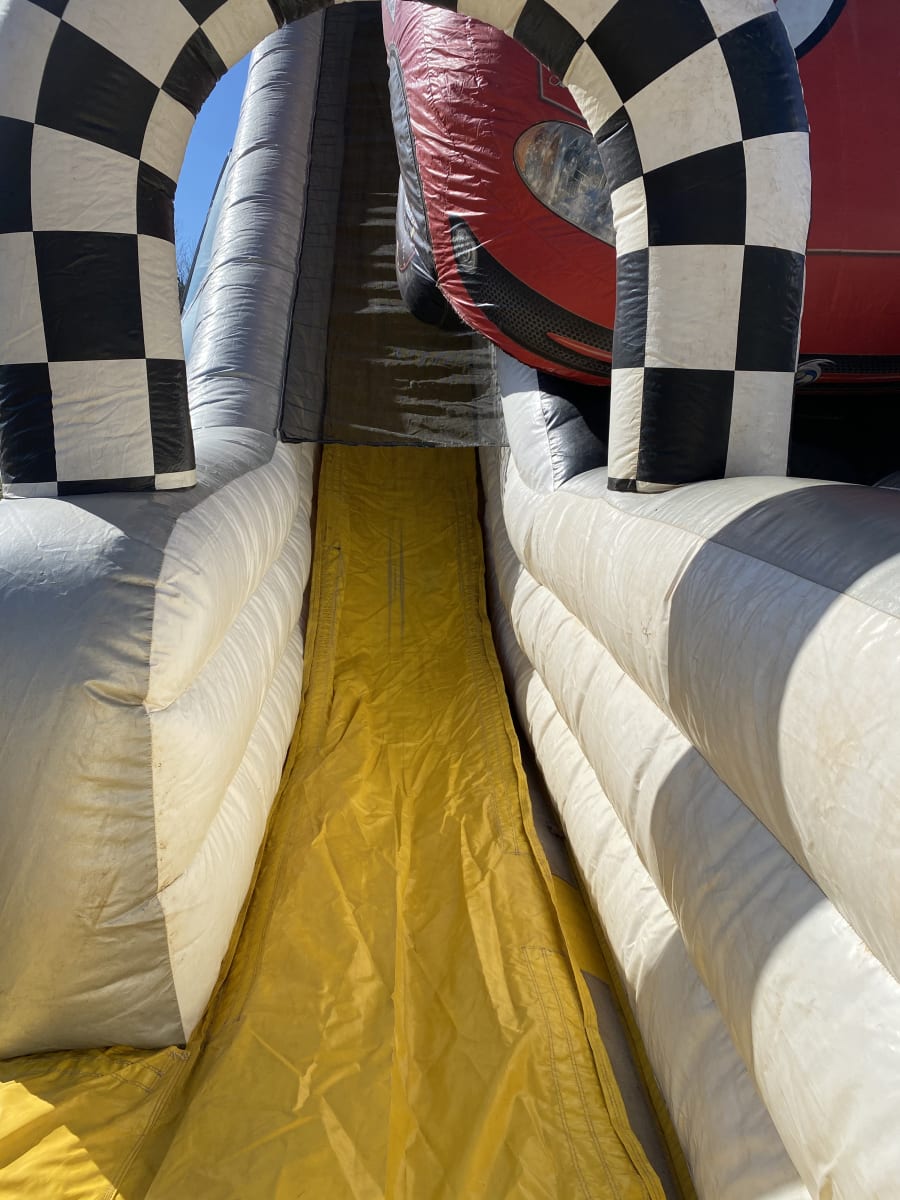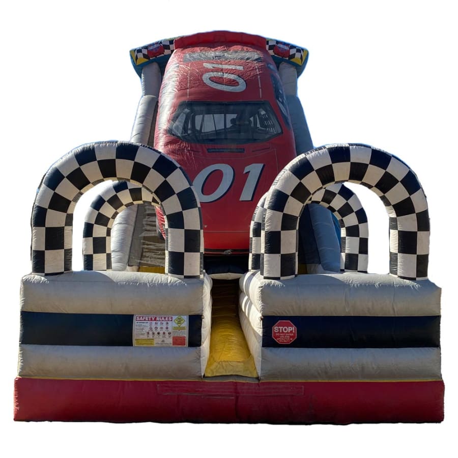 Get ready to climb to the top of our Dual Lane 26ft Victory Lane Slide. This slide is a Dry Only slide and is only available for events. It stands tall and can be a showstopper to bring participants into your event as they will be able to see it from afar. It is themed with a large racecar on the front and is fun for two to slide down at the same time all the way to the bottom. The entrance is in the middle and participants will climb to the top under the racecar and pick a slide to slide down.