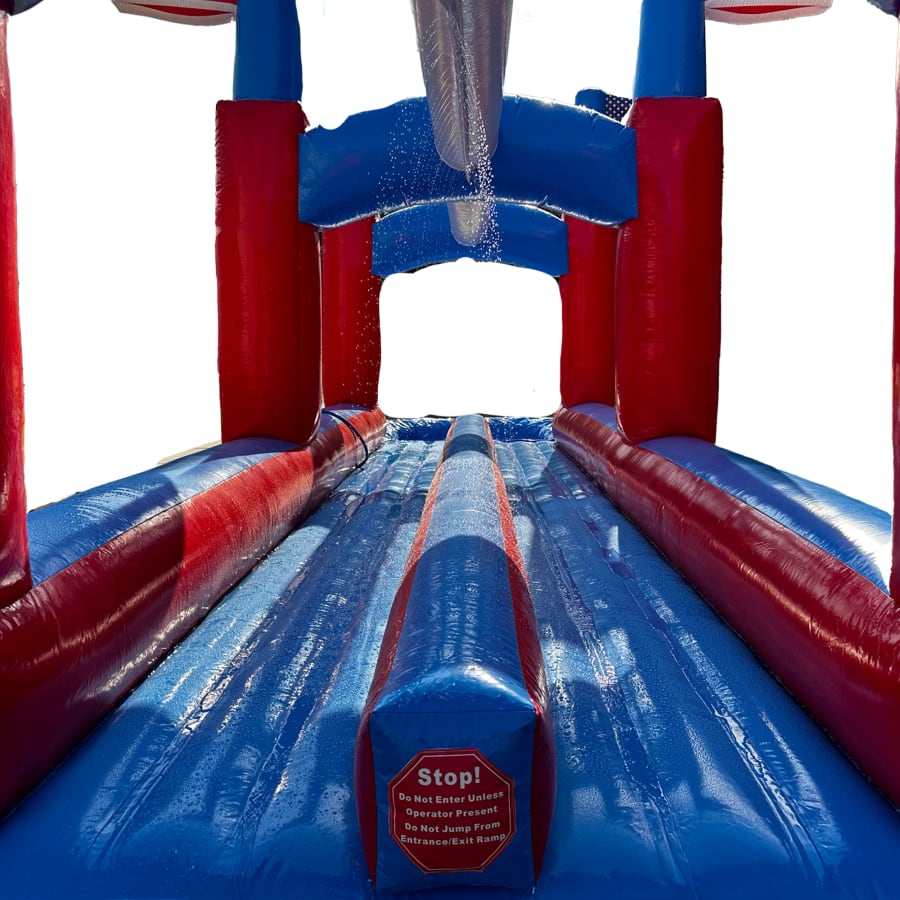 Our 35 foot American Dual Lane Slip-N-Slide is perfect for your party or event. Its double lanes provide an area for two people to slide at one time. The red, white and blue colors and the American flags are perfect for summer parties, especially celebrating one of the many holidays we have over the summer, such as July 4th. Our American Dual Lane slip-n-slide is sure to provide plenty of fun for your event.
