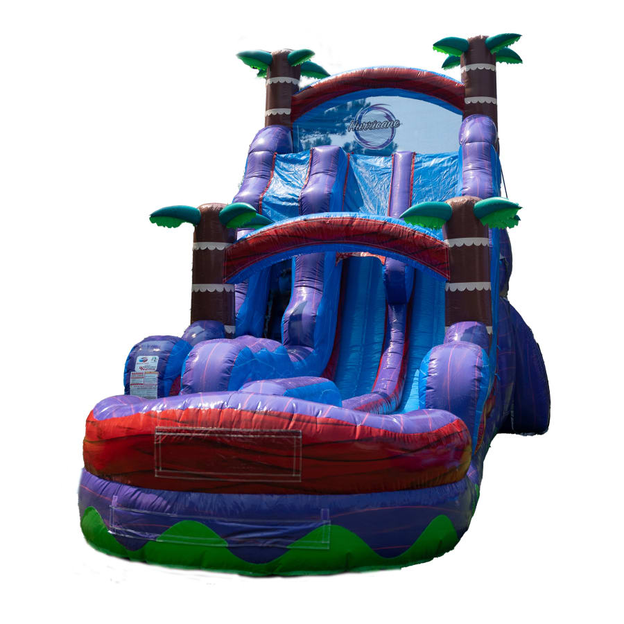 NEW FOR 2023! Go big or go home with our 22ft Hurricane Extended Double Lane waterslide. Do you have a large group of people coming to your party or event? This waterslide is perfect for all ages and has two lanes to race to the bottom of the slide. This creates an all around fun experience for your party as sliders race down each slide and make it into the pool at the bottom. It is 22ft tall, and has an extended landing zone that leads into an inflated pool area that holds water.