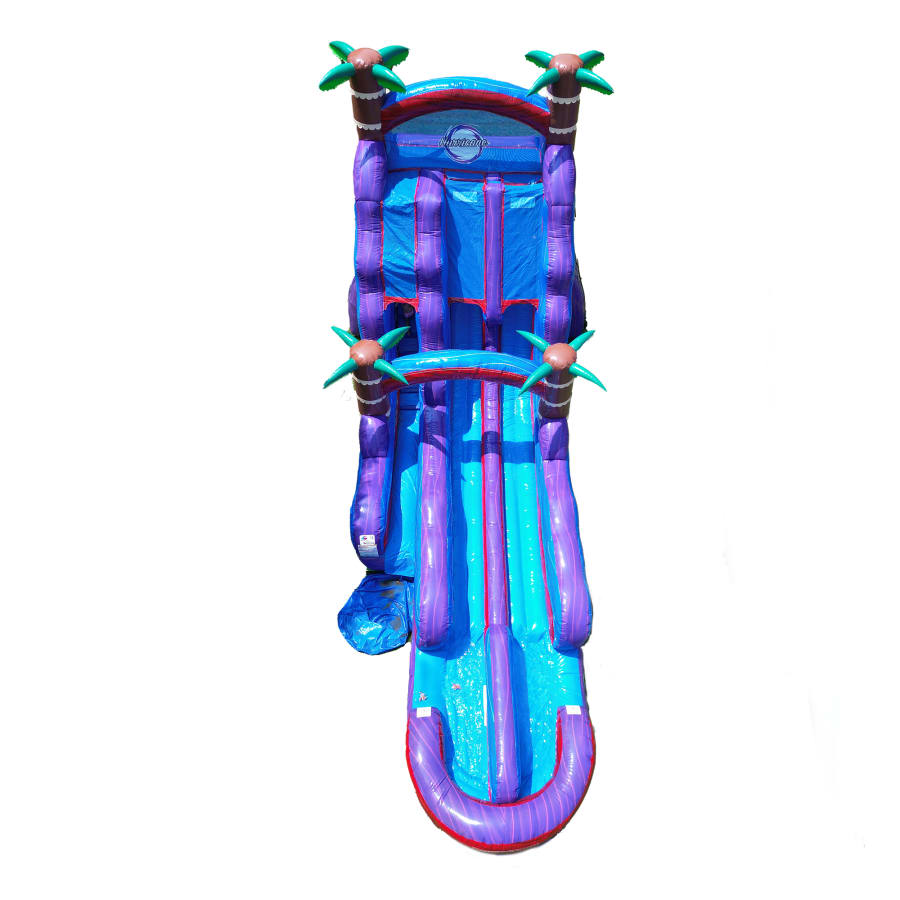 This 22ft Hurricane Extended Double Lane waterslide gives you more bang for the buck with the extended lane. When you come down the super steep 22ft slide you have an extended area that you are able to slide down before you reach the end of the inflated pool area of the slide. That gives riders more fun and it makes the slide more safe as larger riders are able to have more distance to slow down before the end of the slide.
