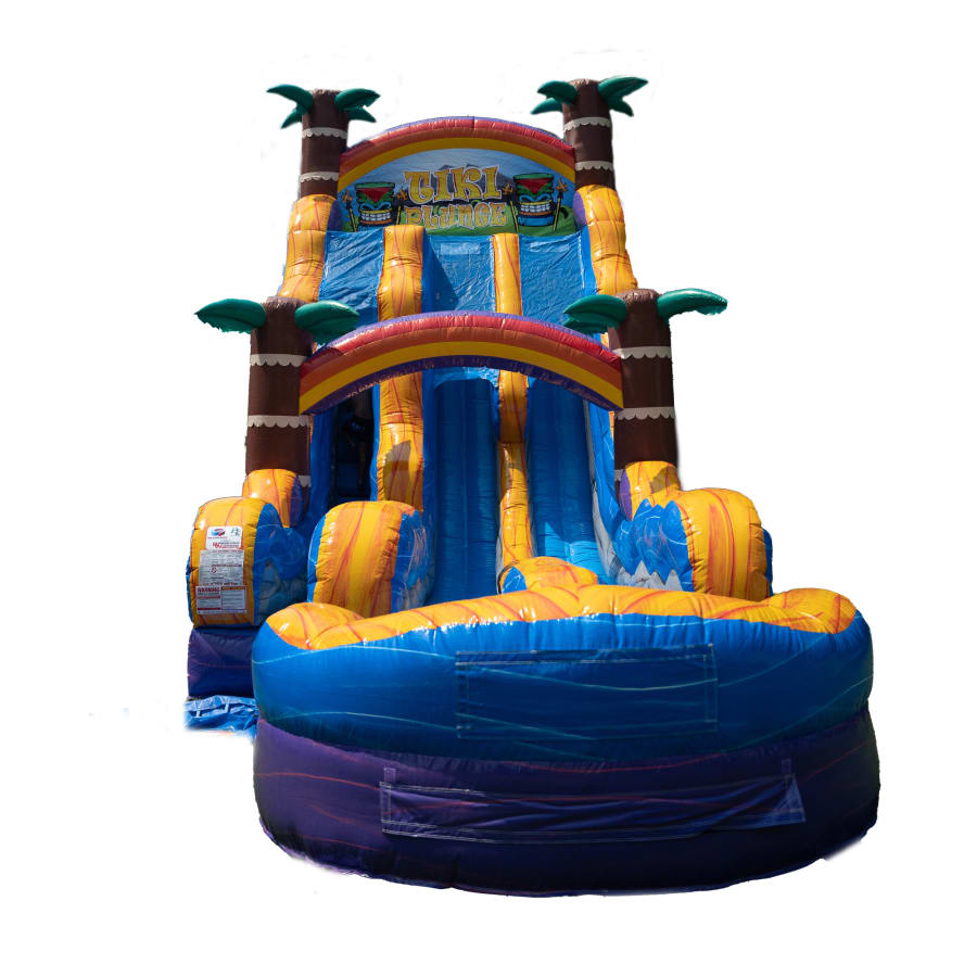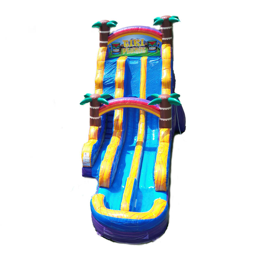 This 22ft Tiki Plunge Extended Double Lane waterslide gives you more bang for the buck with the extended lane. When you come down the super steep 22ft slide you have an extended area that you are able to slide down before you reach the end of the inflated pool area of the slide. That gives riders more fun and it makes the slide more safe as larger riders are able to have more distance to slow down before the end of the slide.