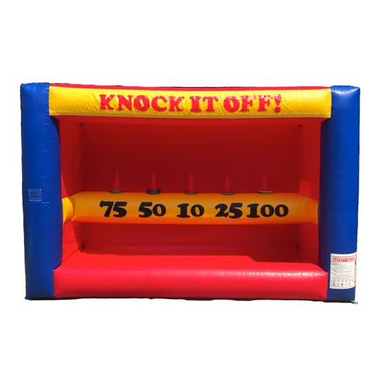 Knock-It-Off is an interactive game that allows players to throw rings over the cones or use a ball to knock the floating balls off of each cone. The balls that are placed on the cones will float in the air when a stream of air is pushed through the cone. Each ball that is floating has its own point value. Once all the balls are knocked off, the winner is named.